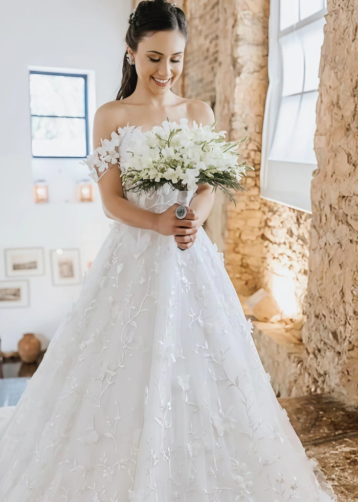 Crafted with high - quality tulle and adorned with delicate floral appliqués, the dress not only looks luxurious but also feels incredibly soft against the skin. The intricate details of the floral patterns add a touch of romance and elegance, making it a perfect choice for a timeless bridal look.