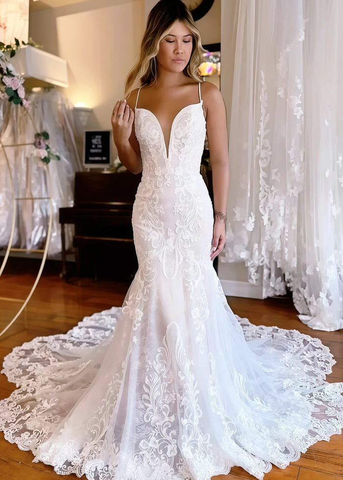 Indulge in the allure of our breathtaking mermaid - style wedding dress. The deep V - neckline and delicate spaghetti straps create a feminine and elegant look, while the fitted bodice hugs your curves perfectly, accentuating your silhouette.