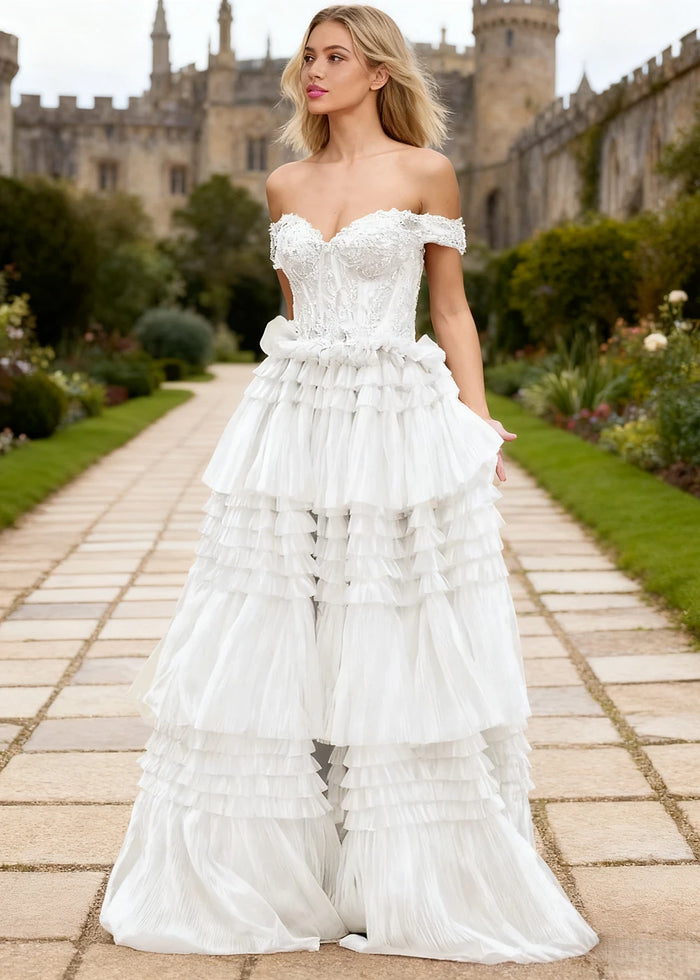 Look stunning in our beautiful sparkly white tiered tulle prom dress! It's perfect for your special night. This dress has sparkly sequins and pretty lace all over. The top is off-the-shoulder with a sweetheart neckline. The skirt is made of soft tulle layers, so it's full and fluffy. The back ties up with a cute lace-up design. Inside, it's fully lined for comfort. You'll feel like a princess at prom, weddings, or any fancy party. Get ready to turn heads and have fun!